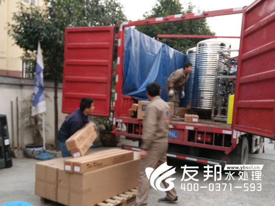 师傅们正在装车发货的是郑州友邦生产的型号为YB-CJS-002的2吨纯净水设备。这套设备是用在郑州高新区机械厂的生产用水。