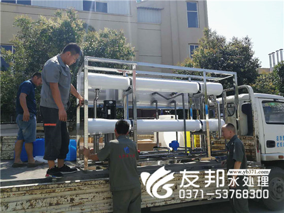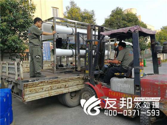 这套型号为YB-CJS-005,每小时出水5吨的单级水处理设备是发往新乡的,工人们冒着炎炎夏日正在装车发货。